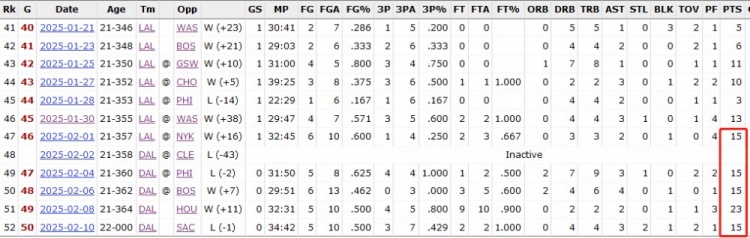 如果算上在湖人的时期,克里斯蒂已经连续6场比赛得分15+(湖人1场,独行侠5场)。