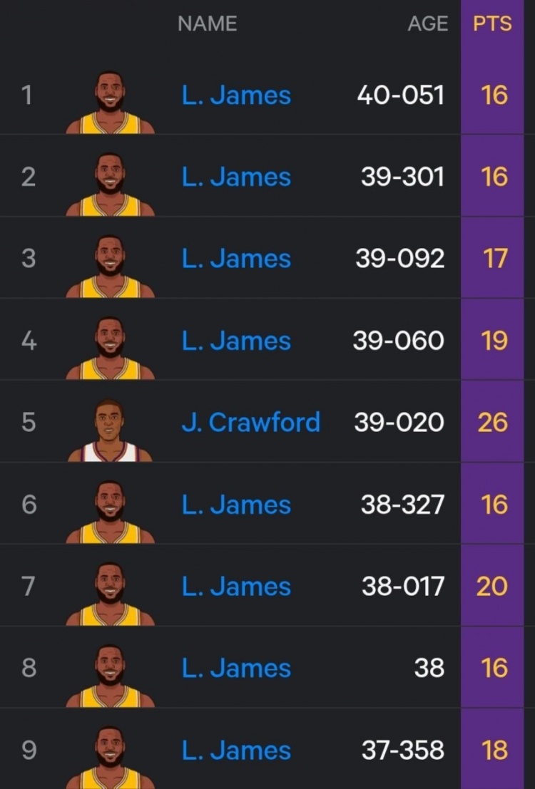 至此,40岁51天的詹姆斯再次刷新了自己保持的历史最老末节得分16+纪录,此前创纪录时詹姆斯39岁301天。