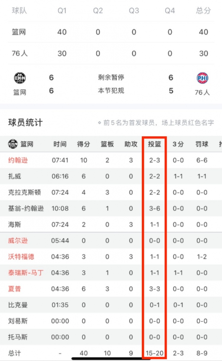 首节比赛,篮网进攻端投篮效率贼高,除基翁-约翰逊和卡梅隆-约翰逊有投丢外,其他有出手的球员皆全中,全队20投15中,命中率高达75%!