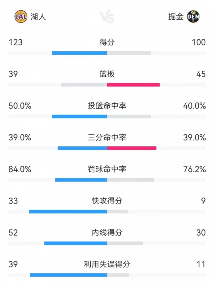 在利用对方失误得分上,湖人也是39-11遥遥领先掘金。