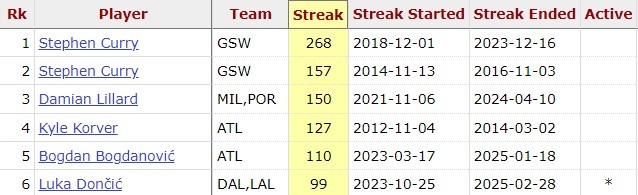据统计,东契奇目前已经连续100场比赛有三分入账,是历史上第5位做到的球员。