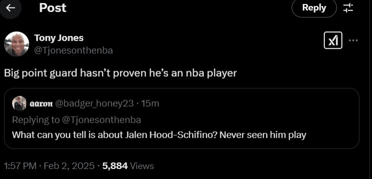 记者Tony Jones回复道:“高大的控球后卫(198cm)还未能证明自己具备NBA球员的实力。”