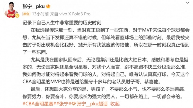 全明星正赛南北区对决时,北区明星队最终以159比136战胜南区明星队,北区中锋邹雨宸砍下23分,获得全明星赛MVP。值得一提的是,张宁在比赛末节时刻面对夹击,并没有选择“单打刷分”,而是传球给了邹雨宸,助力邹雨宸完成暴扣,进而拿下MVP。