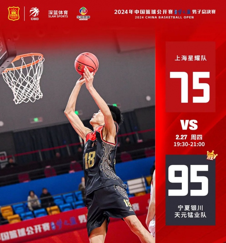 上半场,两队打得相对胶着,比分紧咬。首节战至19-18,上海星耀领先一分。次节28平后,上海星耀24号刘畅连续命中三分,21号高文浩两分再打中,12号周顾轩1投1罚得3分,上海星耀打出一波得分小高潮。随后宁夏天元锰业奋起直追,上半场结束,上海星耀47-42领先宁夏天元锰业。下半场,8号于思洋、29号于哲扛起宁夏天元锰业进攻大旗,在第三节实现反超。末节,上海星耀手感欠佳,宁夏天元锰业在外线多次投中,继续扩大领先优势,最终上海星耀75-95不敌宁夏天元锰业。