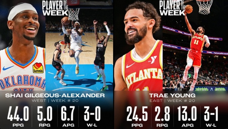 3月11日讯 今日NBA官方宣布,老鹰后卫特雷-杨和雷霆后卫亚历山大分别被评为2024-25赛季第20周东西部周最佳球员。