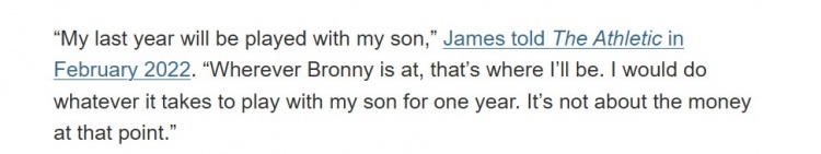 2022年2月,詹姆斯在接受The Athletic采访时第一次谈到父子同台的愿望:“我在生涯最后一年会和我儿子一起打球,无论布朗尼在哪里,我都会去那个地方。我愿意做任何事情来实现与我的儿子一起打球一年。届时钱也就不重要了。”
