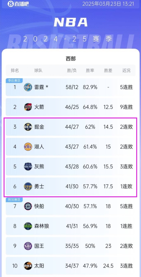 西部第3的掘金、第4的湖人、第5的灰熊和第6的勇士最近都在输球;第7的快船打出5连胜,森林狼位居第8,两队都和第6的勇士(季后赛直通区)只差0.5个胜场;第2的火箭豪取一波9连胜稳住目前的排位;雷霆此前已经锁定西部第一的位置。