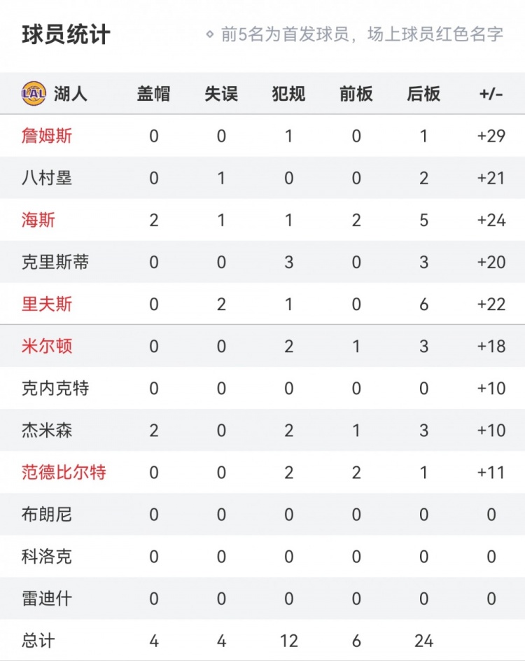 半场比赛,湖人每名出场球员正负值都很高,均达到了两位数。