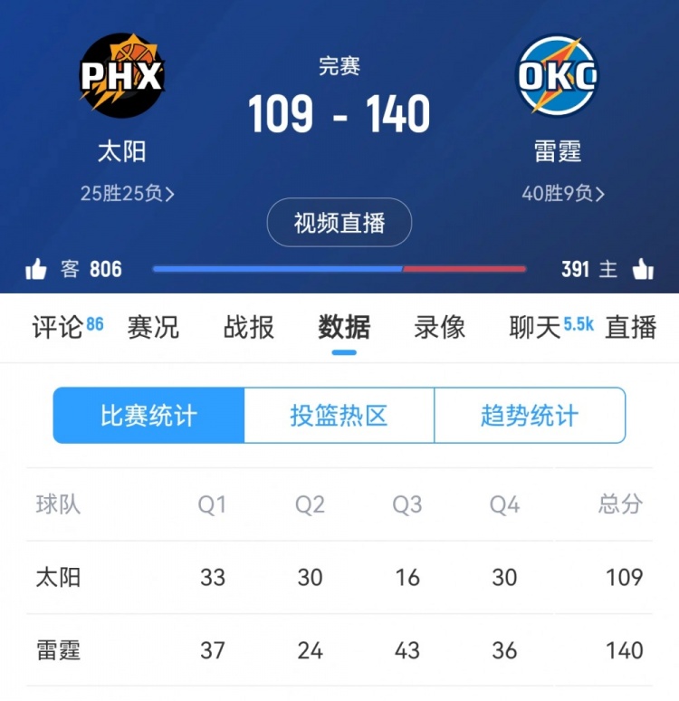 2月6日讯 NBA常规赛,太阳109-140大比分不敌雷霆。