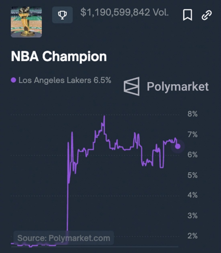 2月7日讯 NBA交易截止日已过,据博彩网站信息,湖人在交易截止日前夺冠赔率为+5782,目前暴涨至+270(押100,若中则连本带利返还370),目前夺冠概率为6.5%。