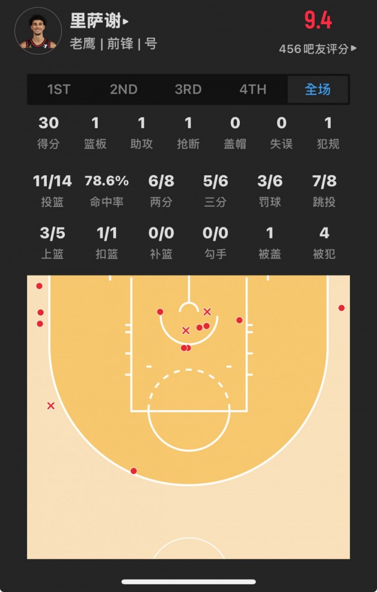 老鹰状元秀 扎卡里-里萨谢 登场25.4分钟