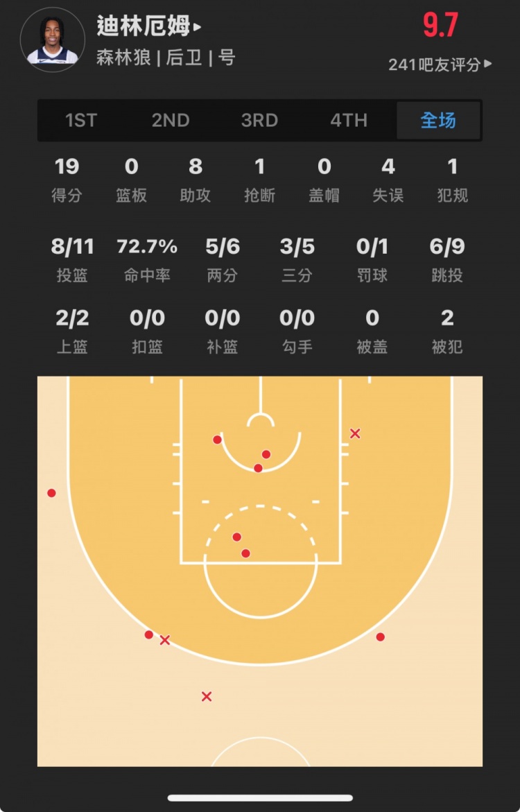 森林狼8号秀 罗布-迪林厄姆 登场23.1分钟