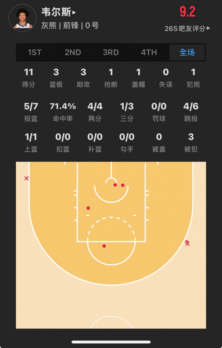 灰熊39号秀 杰伦-韦尔斯 登场30.1分钟