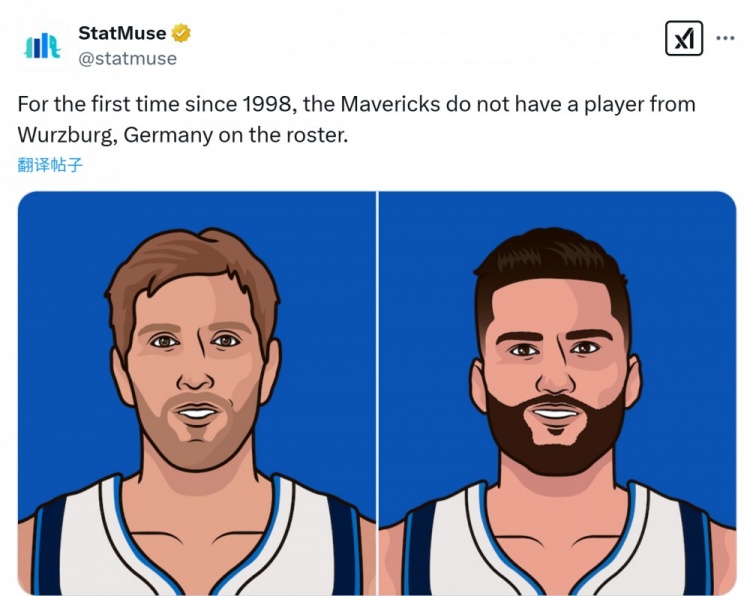 美媒:独行侠队里没有来自德国维尔兹堡的球员 队史1998年来首次 美媒StatMuse:“这是1998年以来,独行侠首次队里没有一名来自德国维尔兹堡的球员。(诺维茨基和克莱伯均来自此地)” 2025/02/02
