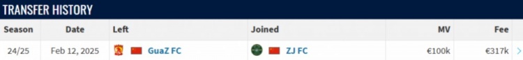2月13日讯 根据德转信息,原广州队门将霍深坪加盟浙江队。