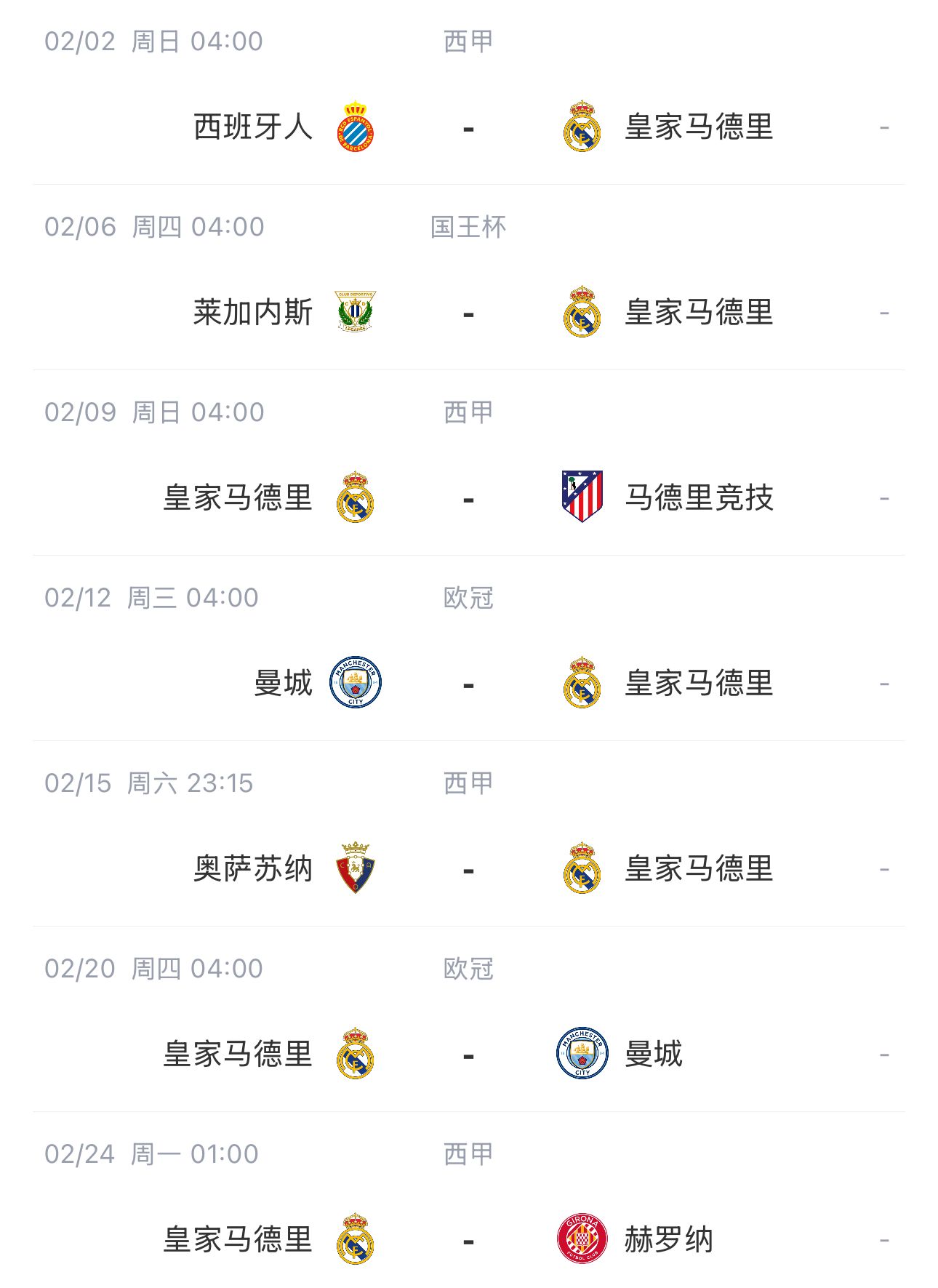 皇马2月面临赛程考验,由于巴萨和马竞直通欧冠16强,皇马比这两位西甲争冠对手多出两场欧冠淘汰赛附加赛,而且附加赛对手还是曼城。