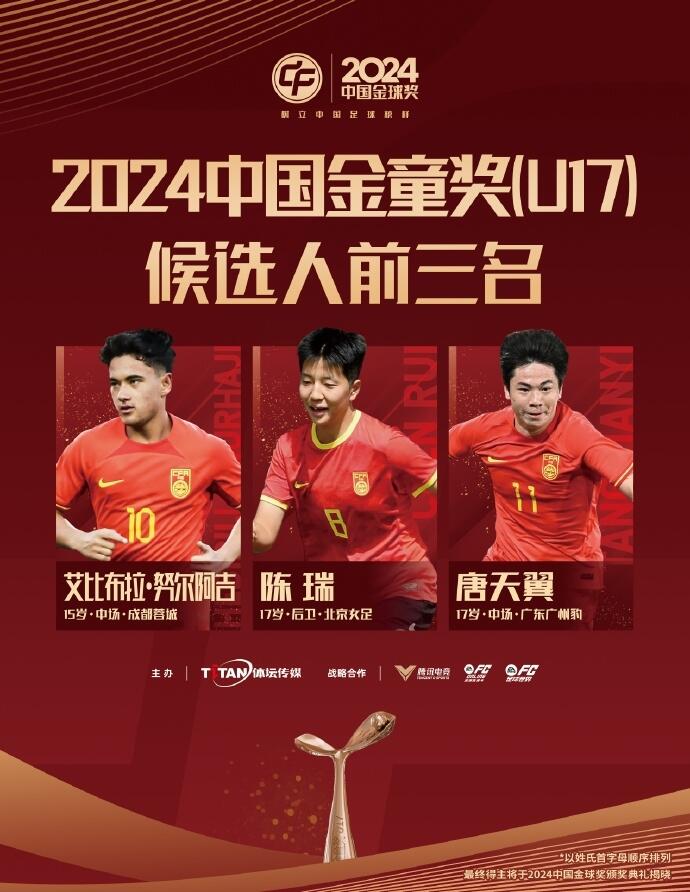 02月13日讯 2024中国金球奖颁奖仪式将于2月13日在杭州举行,现场播放的金童奖(U17)三人候选宣传片显示,近期陷入出轨、赌球风波的唐天翼被移除,魏祥鑫“递补”。