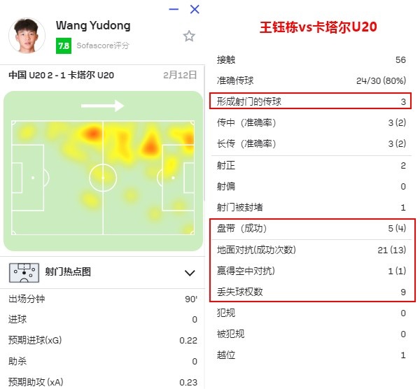 从对战卡塔尔U20比赛中的数据可以看到,王钰栋5次过人4次成功,22次一对一对抗赢下14次,送出3次带来射门的关键传球。