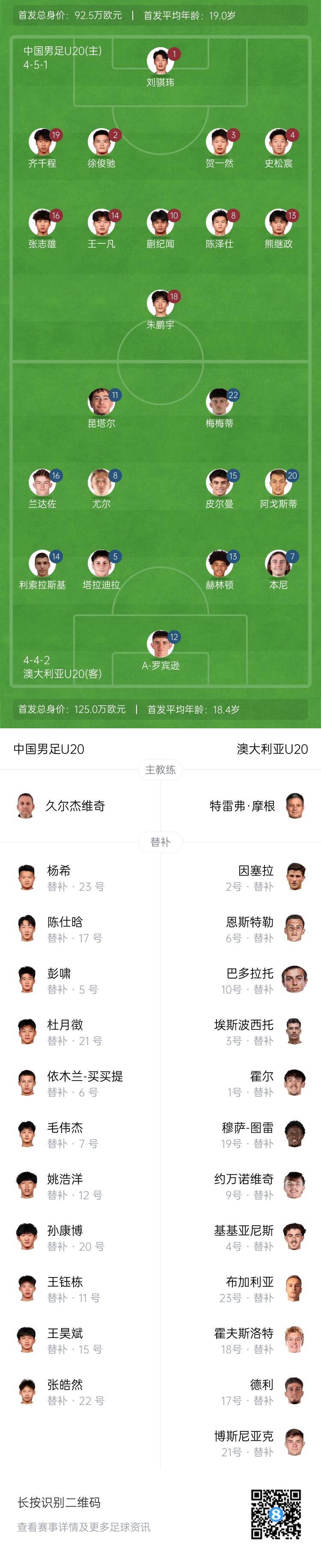 2月18日讯 北京时间19点30分,U20亚洲杯小组赛A组第三轮,中国vs澳大利亚,赛前双方首发公布!本场比赛刘诚宇因累积黄牌停赛,较上场比赛国青首发更换6人,澳大利亚则更换了9人。