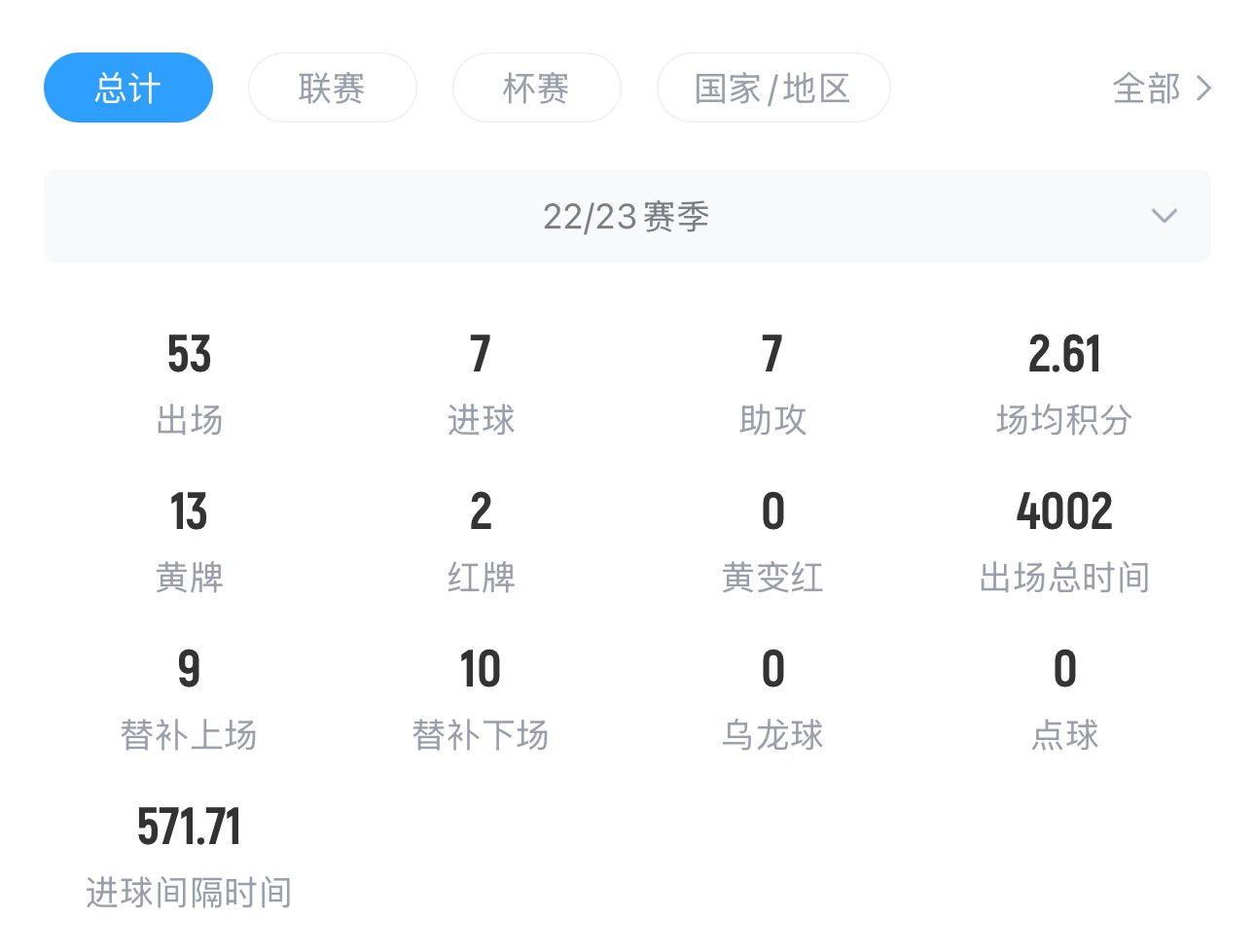 卡塞米罗于2022年夏天从皇马加盟曼联,22/23赛季为皇马出场2次贡献1次助攻,为曼联出场51次,贡献7球6助攻。