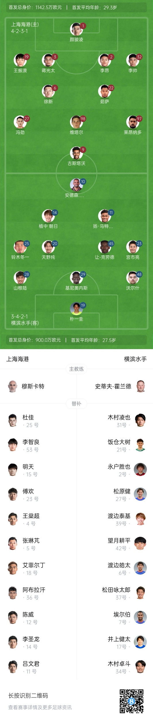 上海海港首发:1-颜骏凌、2-李昂、3-蒋光太、19-王振澳、32-李帅、16-徐新、22-茹萨(F)、98-马特乌斯-维塔尔(F)、9-古斯塔沃(F)、27-冯劲、97-莱昂纳多(F)