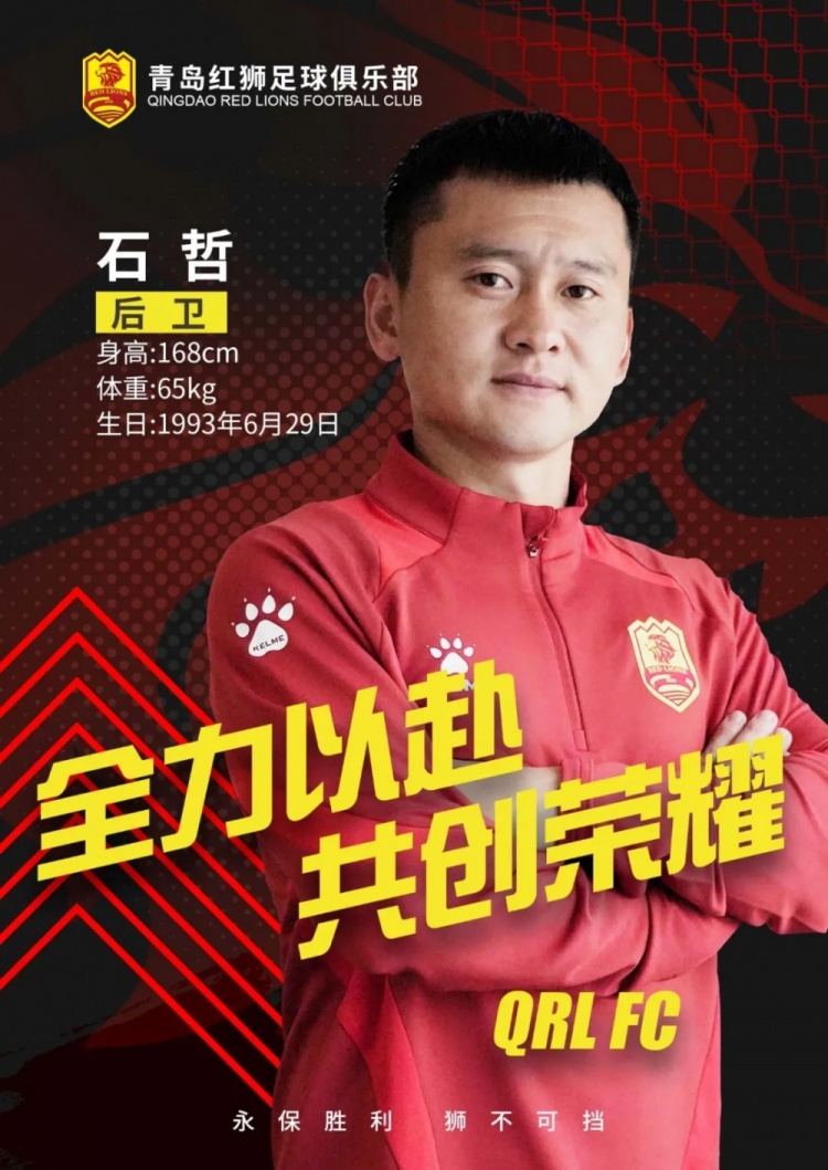 石哲,出生于1993年6月29日,身高168cm,体重65kg,他跑动积极,拼抢凶狠,脚下细腻,战术执行力强,可胜任场上多个位置。2019赛季石哲以绝对主力身份为青岛队在中甲联赛中夺冠并冲超成功立下汗马功劳;2023赛季石哲转会云南玉昆,帮助球队冲甲成功;2024赛季助云南玉昆获得中甲联赛冠军并成功冲超。期待他在加盟球队后迅速融入技战术体系,用经验和斗志为红狮贡献力量!