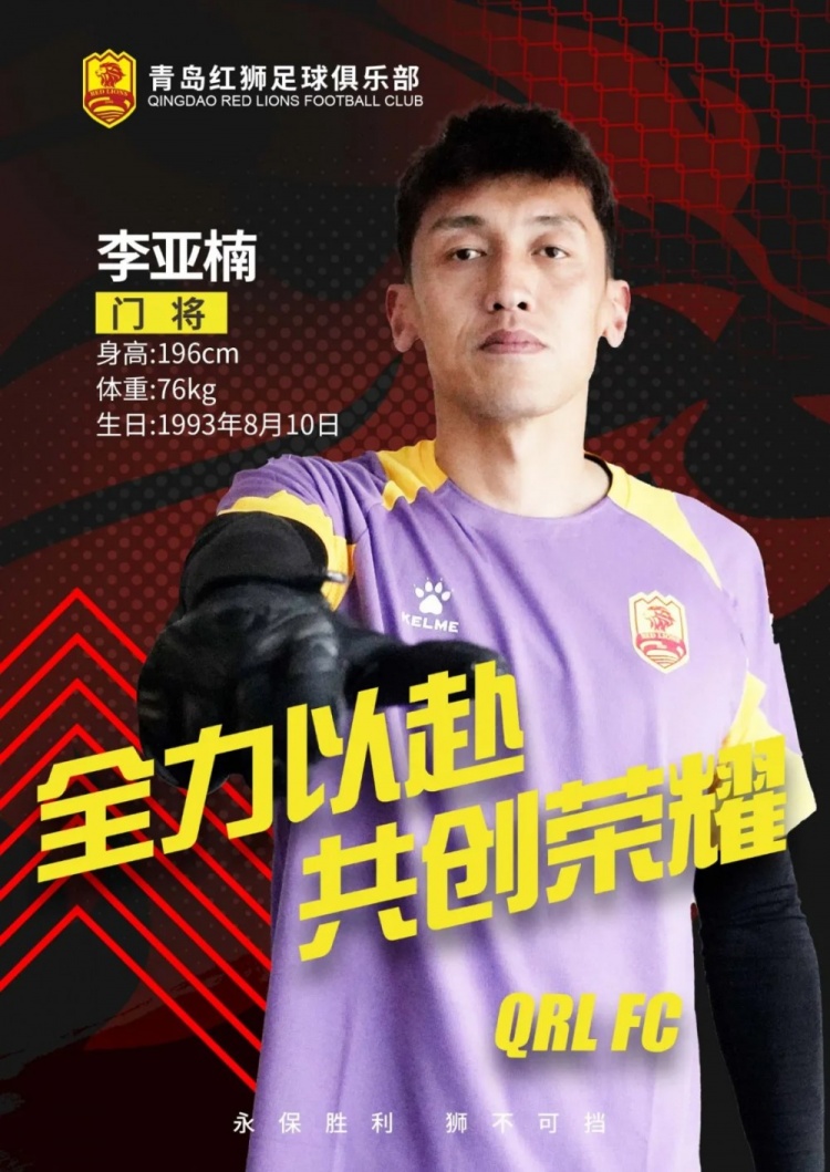 李亚楠,出生于1993年8月10日,身高196cm,体重76kg,脚下技术出色,高空球控制面积大,擅长一对一正面封堵。作为门将,他沉着稳定,2021-2023年加盟苏州东吴足球俱乐部期间,中甲出场25场,曾摘得官方颁发的南京赛区联赛第18轮最佳球员荣誉。相信他会以更好的状态投入到青岛红狮的新征程!
