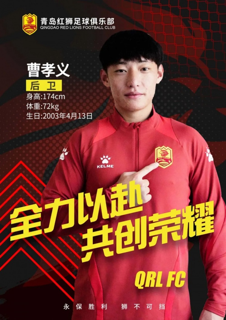 曹孝义,出生于2003年4月13日,身高174cm,体重72kg,场上司职边后卫。2018年入选湖北足协U15队,并以队长身份获得全国青超联赛冠军;2023赛季签约无锡吴钩队,中甲联赛出场14次,1粒进球;足协杯出场1次,首发并打满全场。加入青岛红狮,希望他发挥所长,在稳固后防、边路往返、组织进攻和后场出球上给予红狮更多助力!