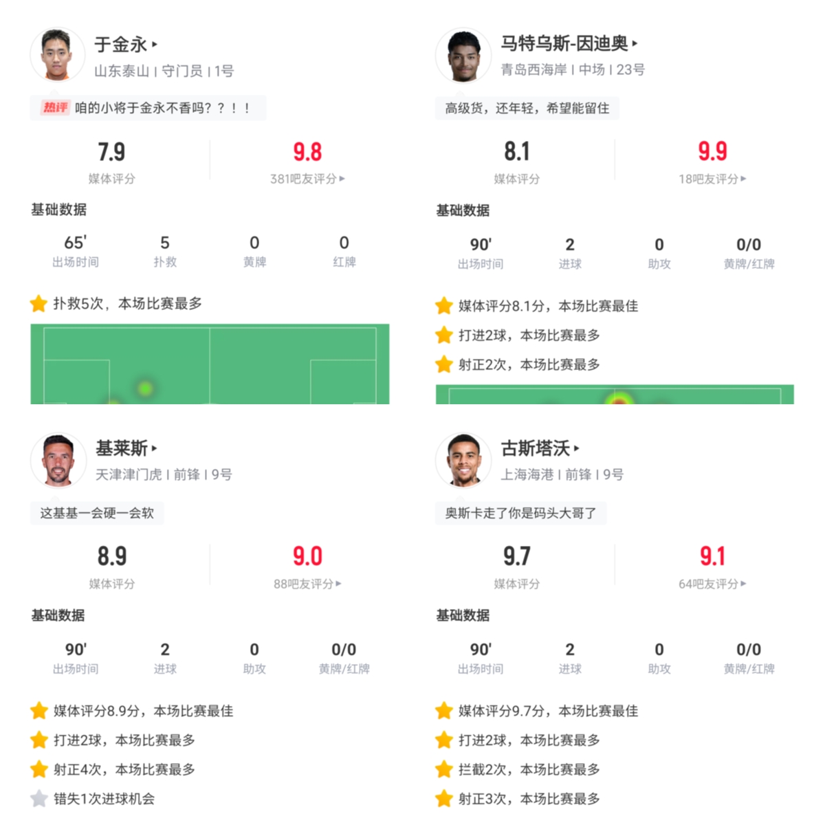 【直播吧】中超首轮最佳球员:于金永险胜,得票率仅多基莱斯1.7%