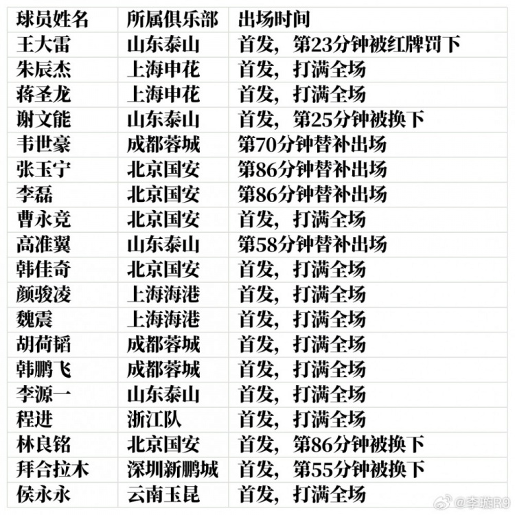 李璇在个人微博中写道:参考国家队1月份的集训名单,统计了一下2025赛季中超首轮国脚的出场情况,图为有出场记录的球员,未出场球员(共13人,费南多因不在中超联赛可忽略不计):蹇韬、杨泽翔、吾米提江-玉苏普、吴少聪、徐皓阳、汪海健、王上源、黄政宇、买乌郎-米吉提、王子铭、杨立瑜、陶强龙、费南多。
