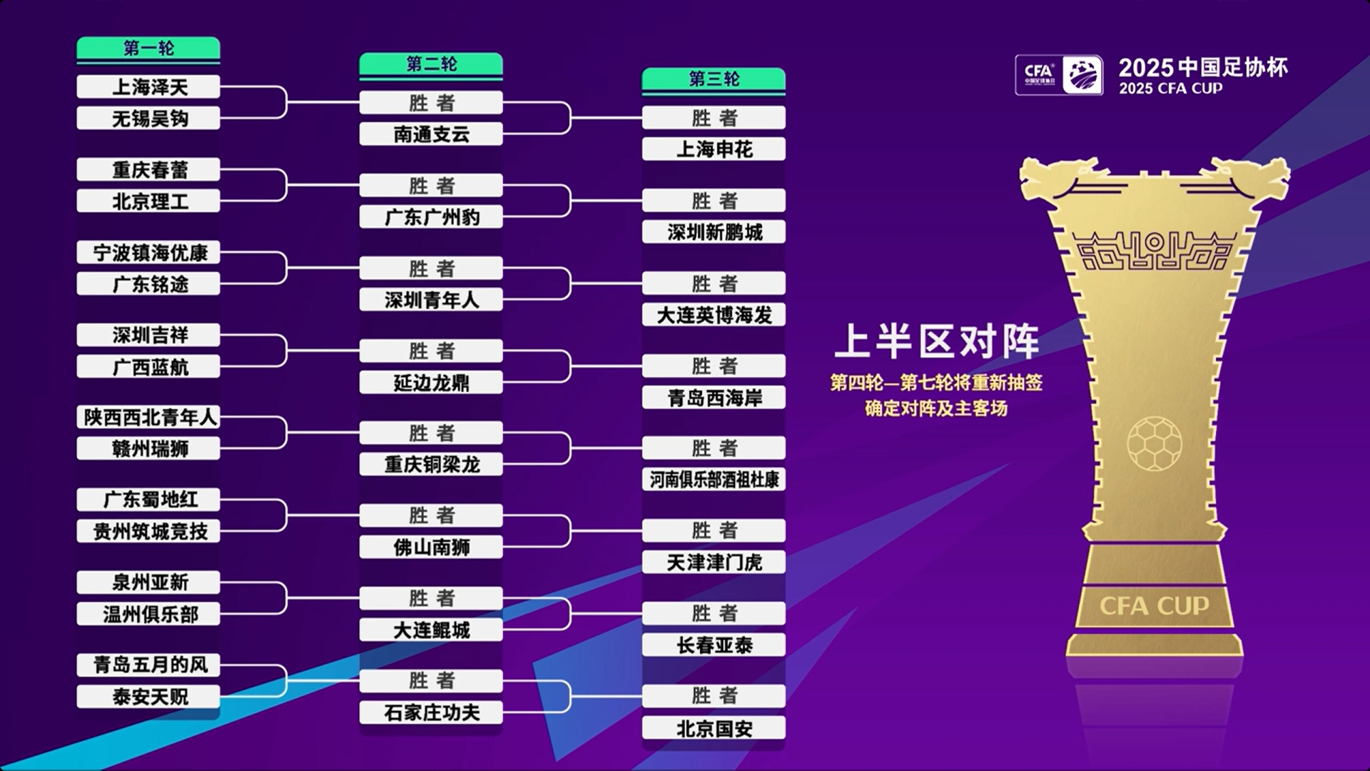 2025中国足协杯正赛将于3月14日开赛,12月5日结束,一共进行7轮,为主客场单败淘汰赛制,共64支参赛队,进行63场比赛,第1轮至第3轮若在90分钟内战平将直接进行点球大战,决赛将于12月5日在苏州奥体中心进行。