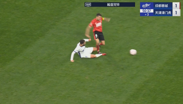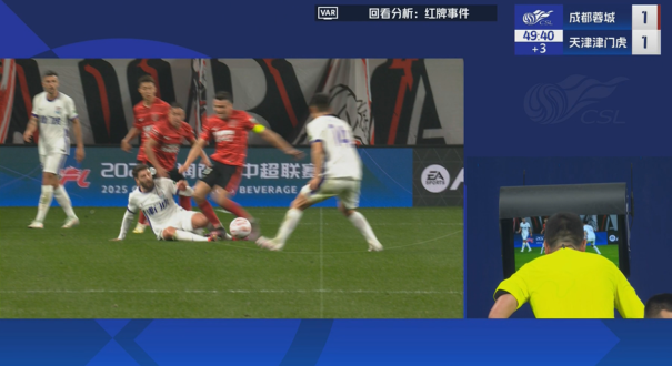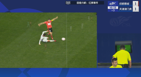 上半场补时阶段,周定洋抢球时踩到哈达斯,视频助理裁判介入,主裁判查看回放后向周定洋出示红牌。