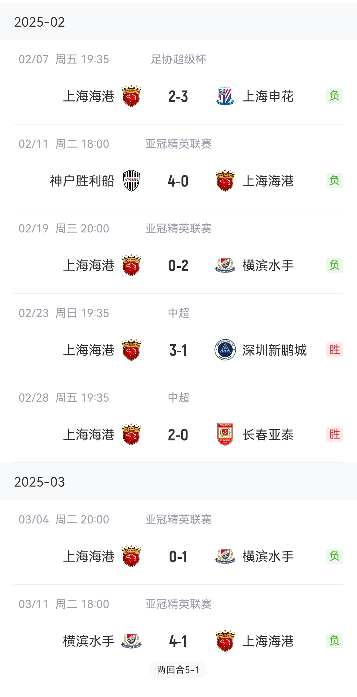 2025年海港超级杯2-3遭申花逆转,亚冠4场全败,联赛则取得了两连胜。