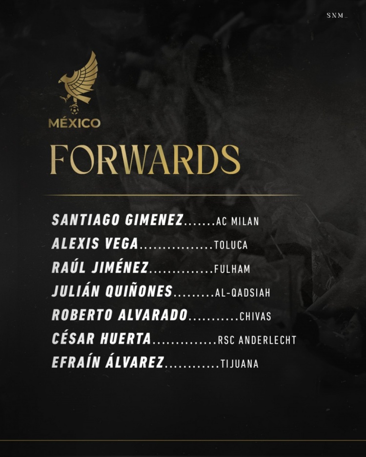 前锋:圣地亚哥-希门尼斯(米兰)、贝加(托卢卡)、劳尔-希门尼斯(富勒姆)、奎尼奥内斯(卡迪西亚)、阿尔瓦拉多(瓜达拉哈拉)、韦尔塔(安德莱赫特)、埃弗林-阿尔瓦雷斯(蒂华纳)