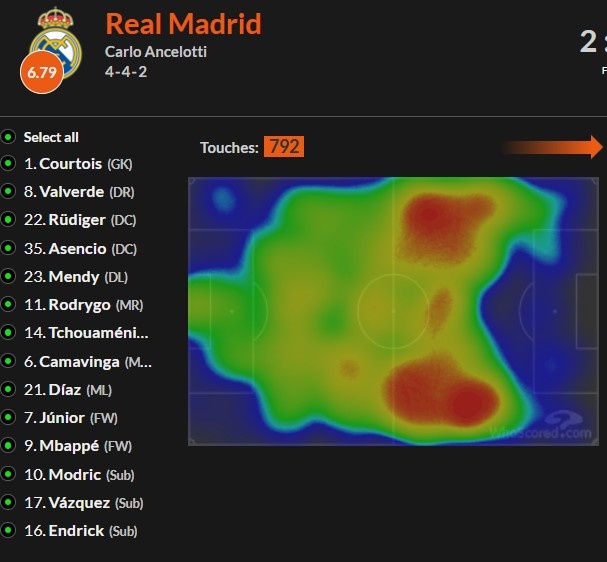 可以想到,因为在缺少大中锋的情况下,他们不可能按照过去有中锋时(哪怕是何塞-卢)那样的传中、抢点、后排套上争抢机会模式来打了。维尼修斯、罗德里戈、包括姆巴佩都是在突击方面远胜过被迫的站桩方面效率选手,因此,他们也会自主扯到边路来踢球