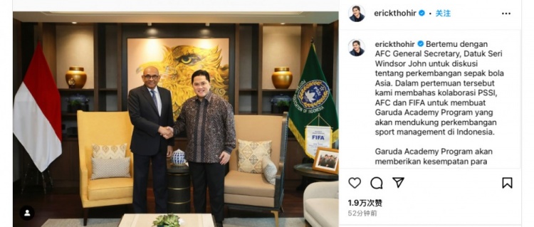 托希尔在社媒配文写道:“今日会见了亚足联秘书长拿督温莎-约翰,会上我们共同就亚洲足球未来的发展方向进行探讨,此外还讨论了印尼足协与亚足联、国际足联合作开办的雄鹰足球学院项目,以进一步促进印尼足球的发展。”