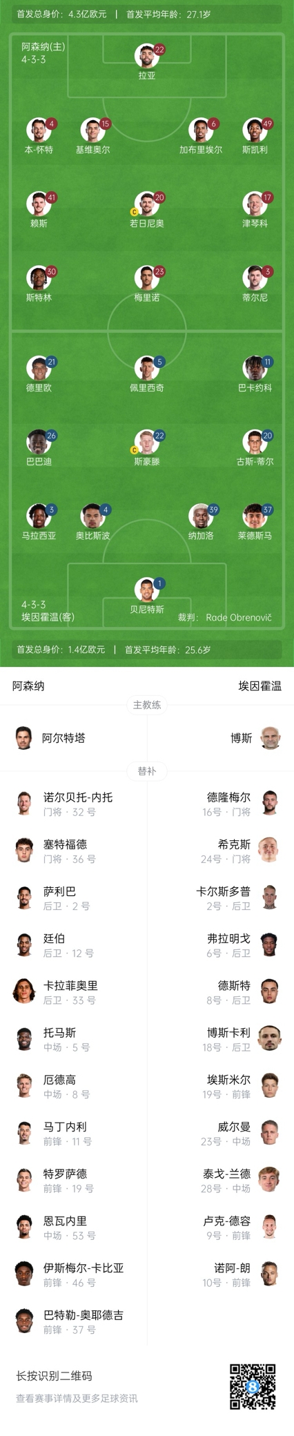都轮换了!阿森纳vs埃因霍温首发:蒂尔尼、斯凯利、斯特林先发