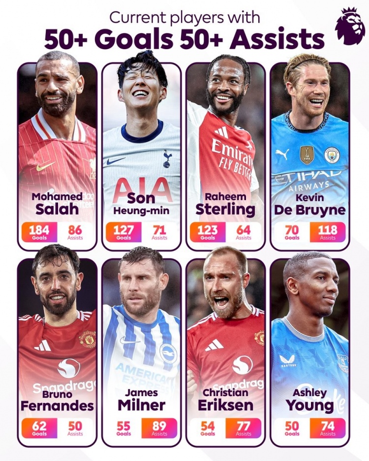 官方统计当前仍效力英超进球+助攻双50+球员: