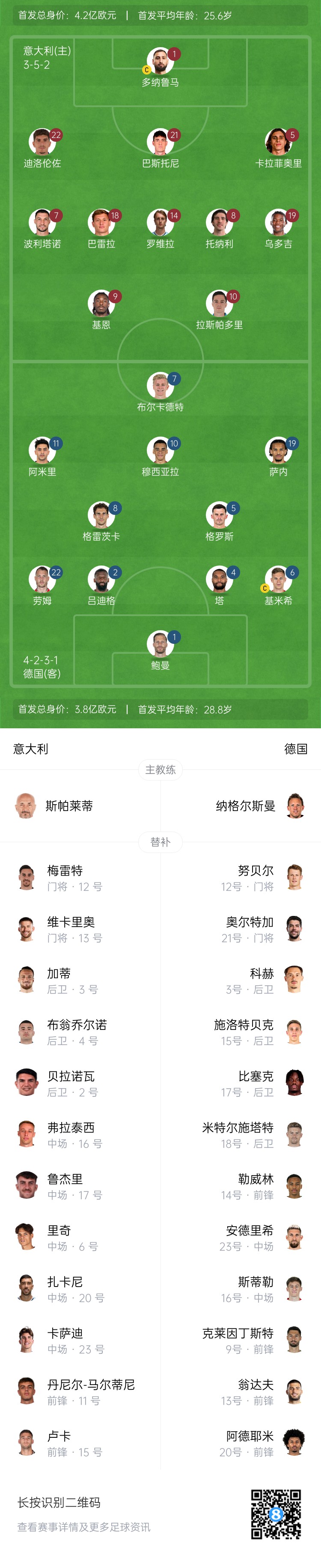 意大利首发:1-多纳鲁马、22-迪洛伦佐、21-巴斯托尼、5-卡拉菲奥里、7-波利塔诺、18-巴雷拉、14-罗维拉、19-乌多吉、8-托纳利、9-基恩、10-拉斯帕多里