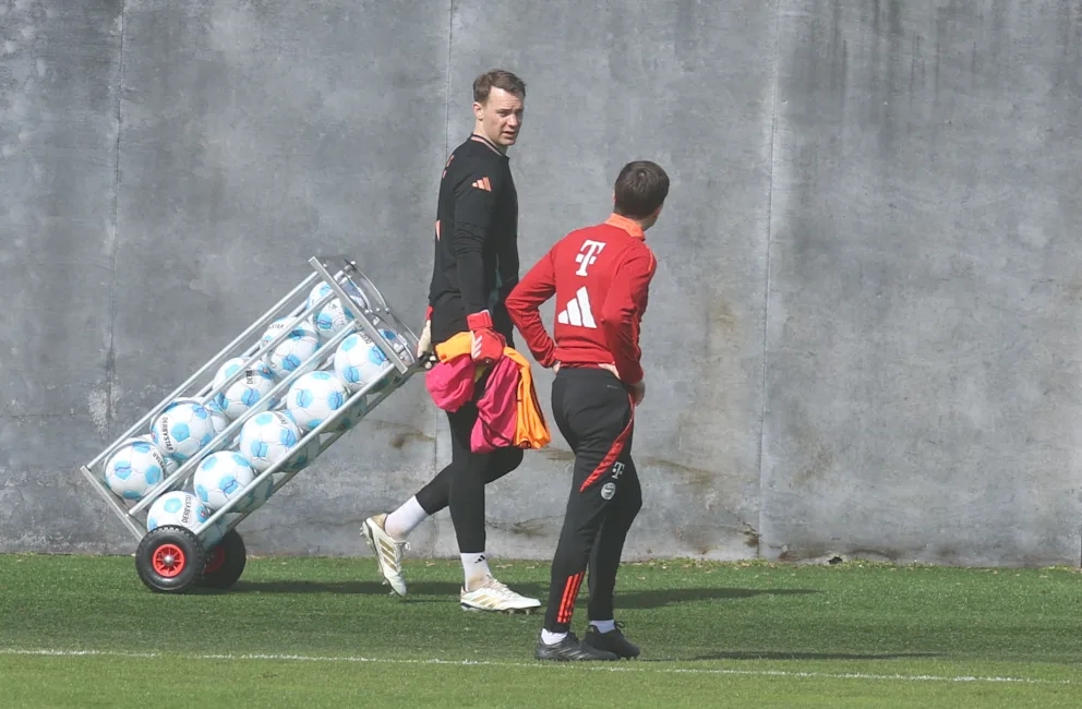 训练情况原本和以往一样顺利,但仅仅35分钟后训练就结束了。诺伊尔被看到和教练员一起收起足球,他跳过了跑动部分的训练,推着球车慢慢走回更衣室,最终未能完成当日的训练。显然,他的小腿出现了肌肉反应。