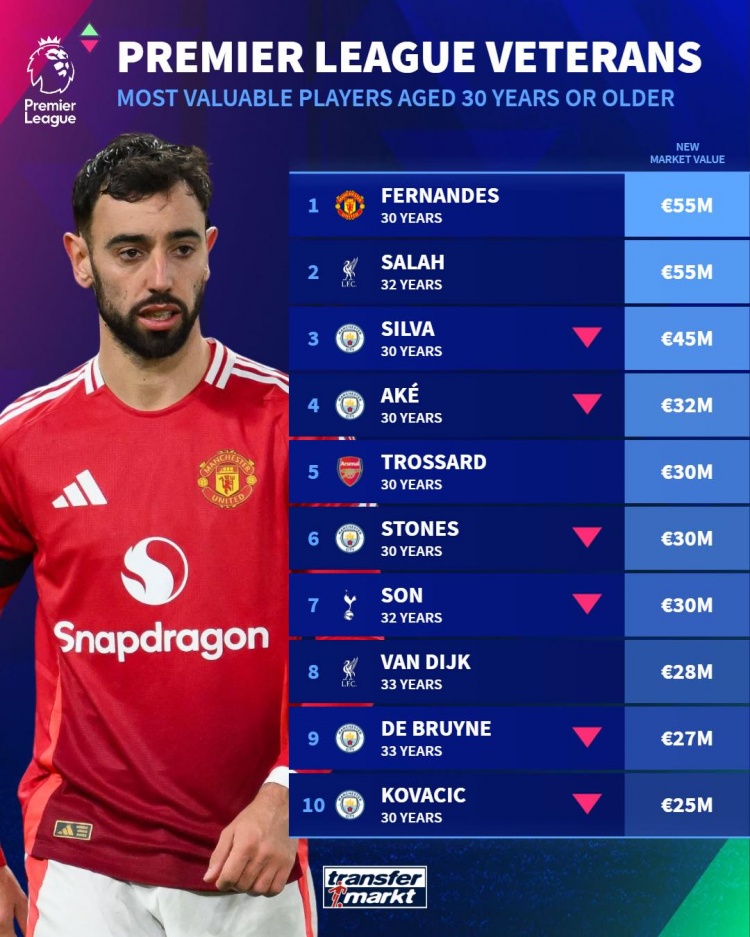 英超年龄30+球员德转身价排名: