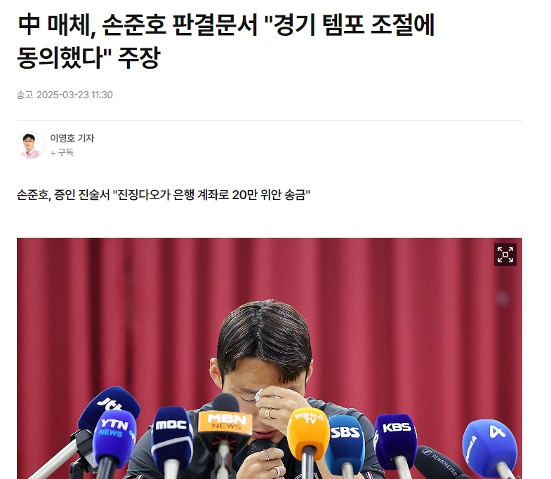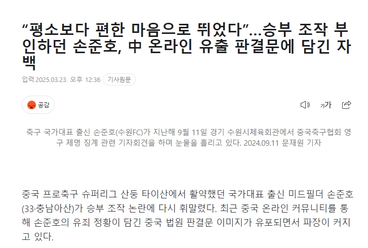 韩媒标题:“我比平时更放松心态比赛”孙准浩否认操纵比赛,但在中国网络上泄露的判决书中承认了这一罪行。