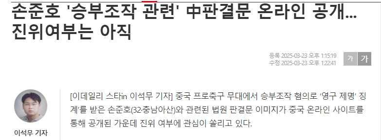 edaily标题:孙准浩假球案判决书在网上发布,真实性尚不清楚。