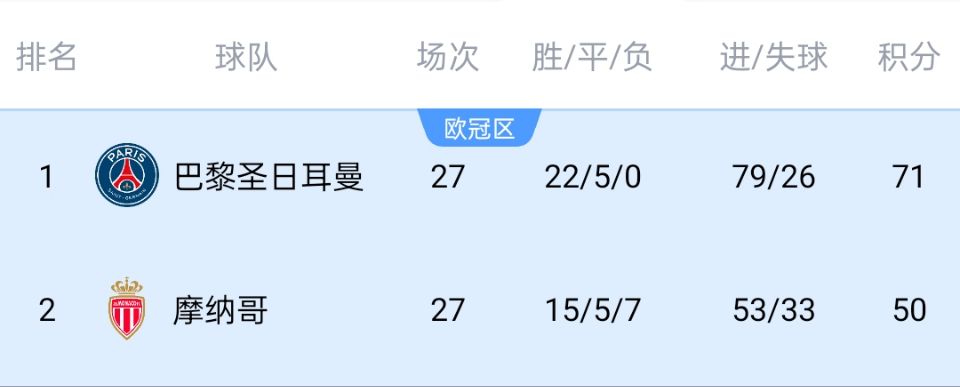 积分榜上,巴黎已经领先摩纳哥21分,几乎已经把联赛冠军放进囊中。这也意味着巴黎之后可全力冲刺欧冠,不必为联赛过多分心。