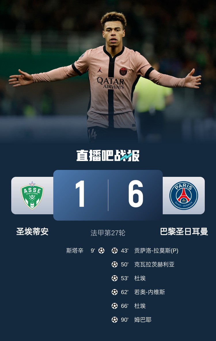 法甲第27轮,巴黎6-1大胜圣埃蒂安,暂以22分优势领跑。上半场,斯塔辛首开纪录,贡萨洛-拉莫斯点射扳平;下半场,克瓦拉茨赫利亚扩大比分,内维斯破门,杜埃梅开二度,姆巴耶打进一球。