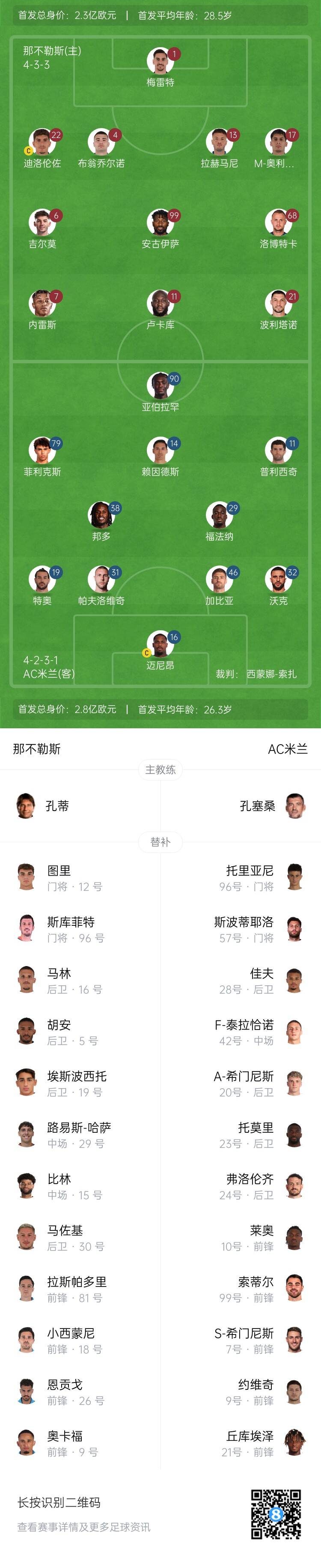 那不勒斯首发:1-梅雷特、22-迪洛伦佐、13-拉赫马尼、4-布翁乔尔诺、17-奥利维拉、99-安古伊萨、68-洛博特卡、6-吉尔莫、21-波利塔诺、7-内雷斯、11-卢卡库