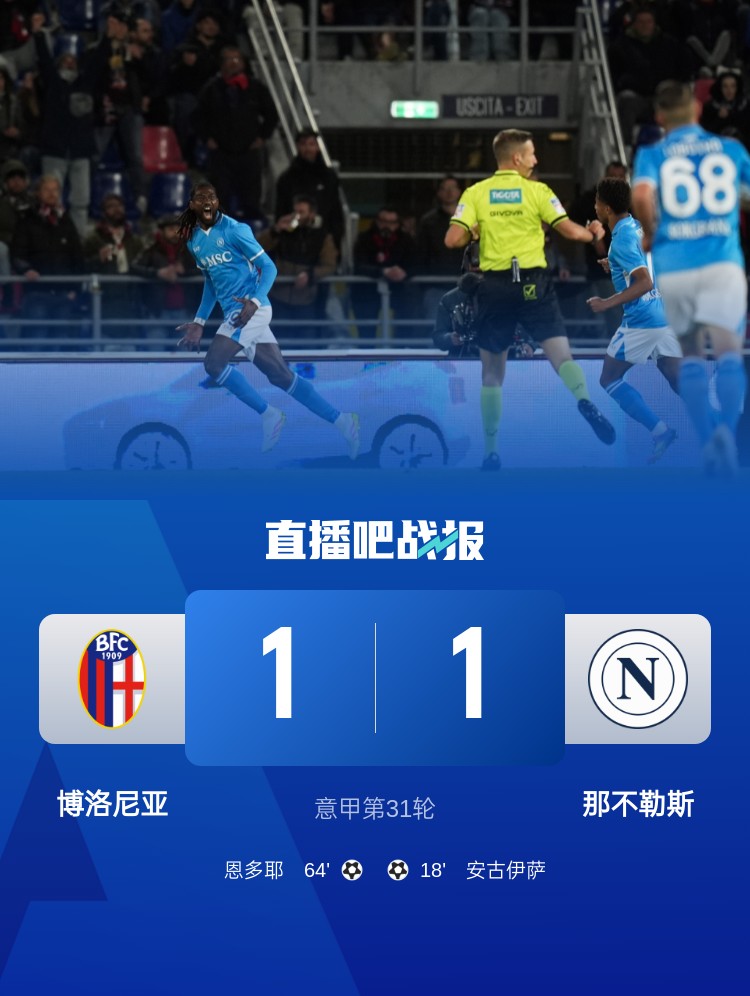 那不勒斯1-1战平博洛尼亚,落后榜首国米3分。