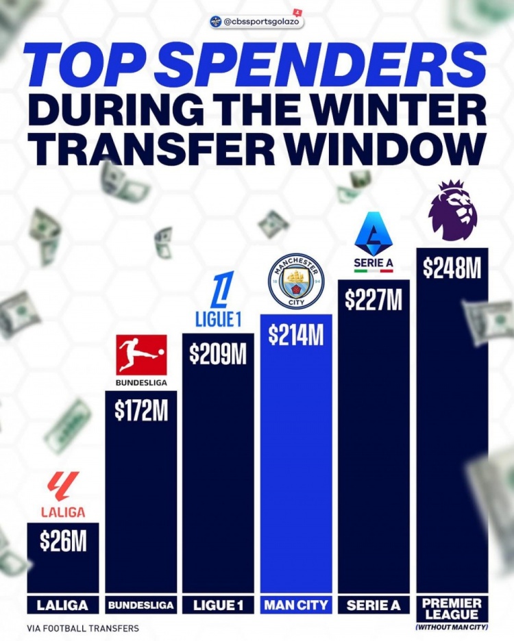 破费2.18亿欧元签入5名球员,超过西甲、德甲和法甲整个联赛的花费,仅支付的溢价便超过1亿欧元,过去的这个冬窗是属于曼城的独角戏,瓜迪奥拉已经做好了围绕哈兰德进行全面重建的准备。