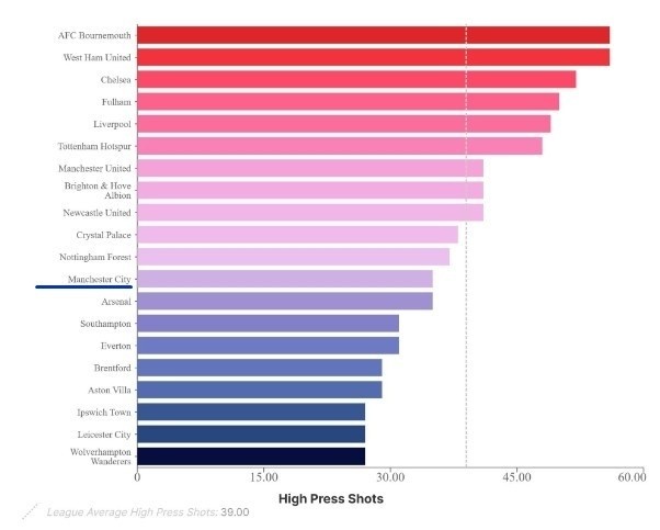 哈兰德加盟之后,曼城的高位压迫效率已经跌至联盟中游,随着京多安和德布劳内的老化,球队的传控能力又出现了明显下降,瓜迪奥拉的球队失去了赖以成名的杀招。