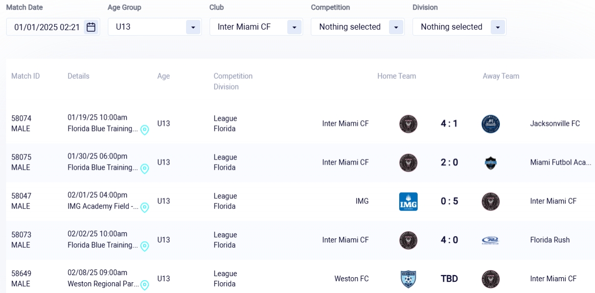 迈阿密U13近期赛程: